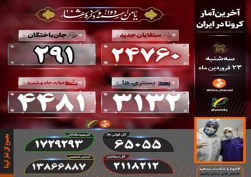 آخرین آمار کرونا در کشور/ فوت ۲۹۱بیمار و شناسایی ۲۴۷۶۰ بیمار جدید