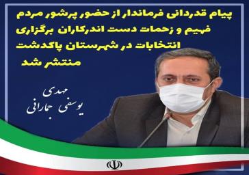 مهدی یوسفی جمارانی فرماندار پاکدشت با صدور پیامی از حضور پرشور مردم فهیم و زحمات دست اندرکاران برگزاری انتخابات در شهرستان پاکدشت قدردانی کرد.