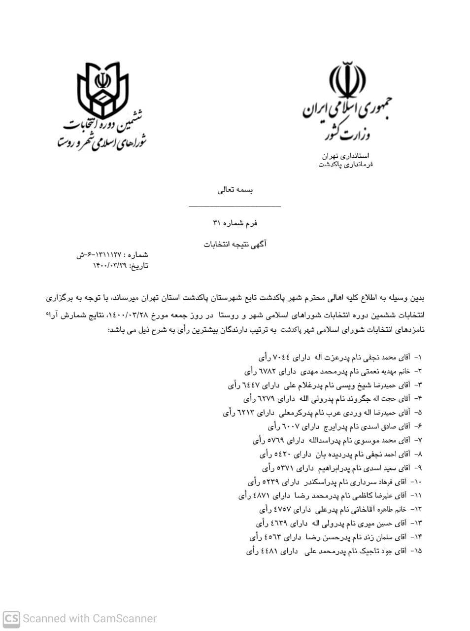 به گزارش کمیته تبلیغات و اطلاع رسانی ستاد انتخابات شهرستان پاکدشت بدینوسیله به اطلاع کلیه اهالی محترم شهر پاکدشت تابع شهرستان پاکدشت استان تهران می رساند با توجه به برگزاری انتخابات ششمین دوره شوراهای اسلامی شهر و روستا در روز جمعه 28 خرداد ماه 1400 نتایج شمارش آراء نامزدهای انتخابات شورای اسلامی شهر پاکدشت به ترتیب دارندگان بیشترین رای به شرح ذیل می باشد :