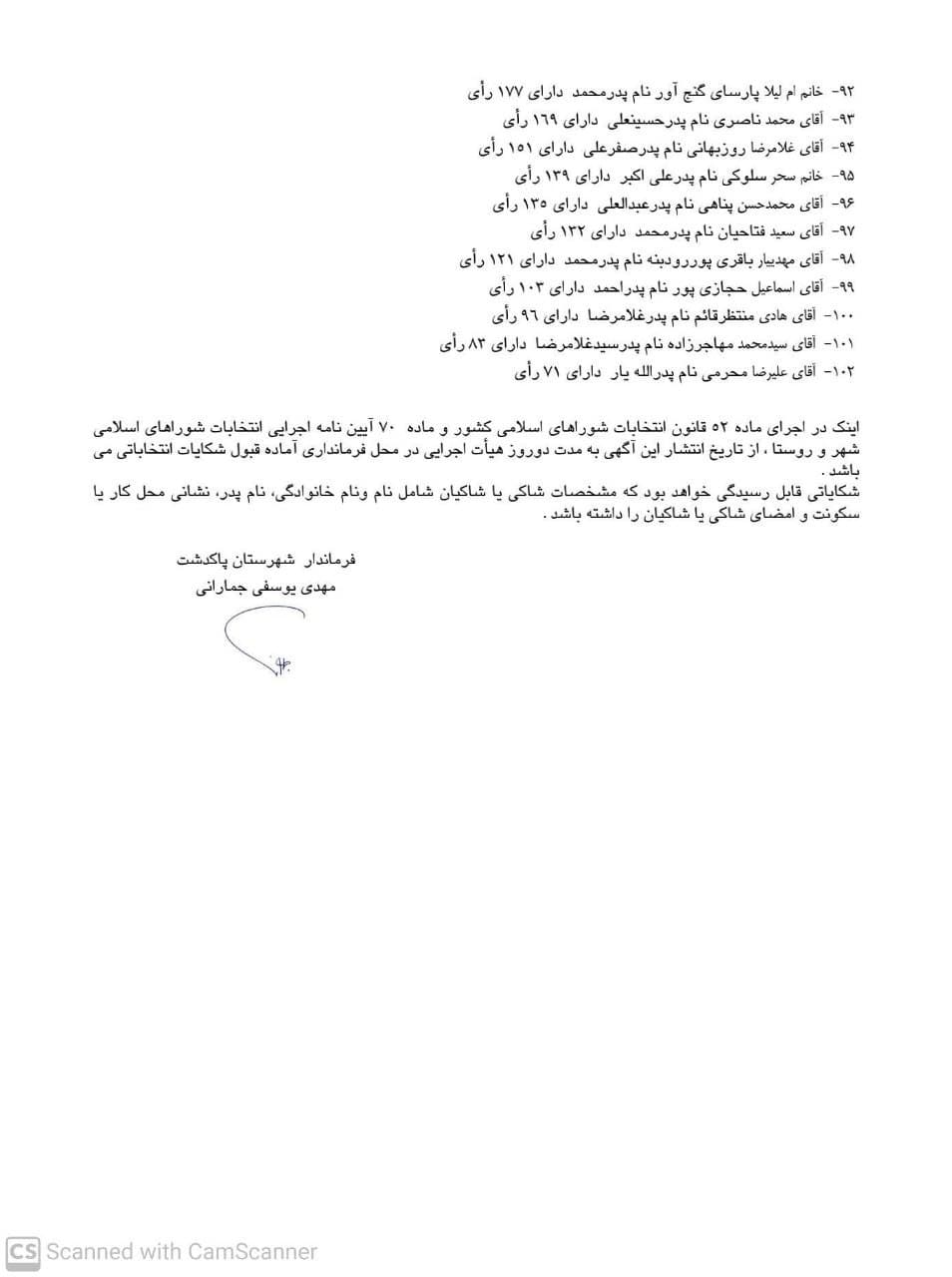 آگهى نتيجه انتخابات ششمین دوره شورای اسلامی شهر پاکدشت