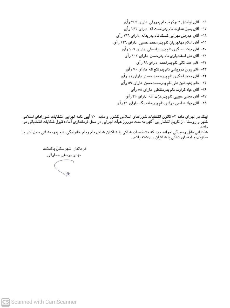 به گزارش کمیته تبلیغات و اطلاع رسانی ستاد انتخابات شهرستان پاکدشت بدینوسیله به اطلاع کلیه اهالی محترم شهر شریف آباد تابع شهرستان پاکدشت استان تهران می رساند با توجه به برگزاری انتخابات ششمین دوره شوراهای اسلامی شهر و روستا در روز جمعه ۲۸ خرداد ماه ۱۴۰۰ نتایج شمارش آراء نامزدهای انتخابات شورای اسلامی شهر شریف آباد به ترتیب دارندگان بیشترین رای به شرح ذیل می باشد :