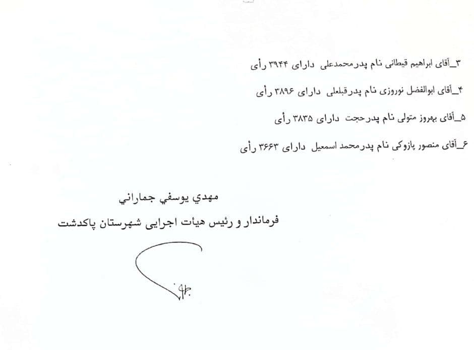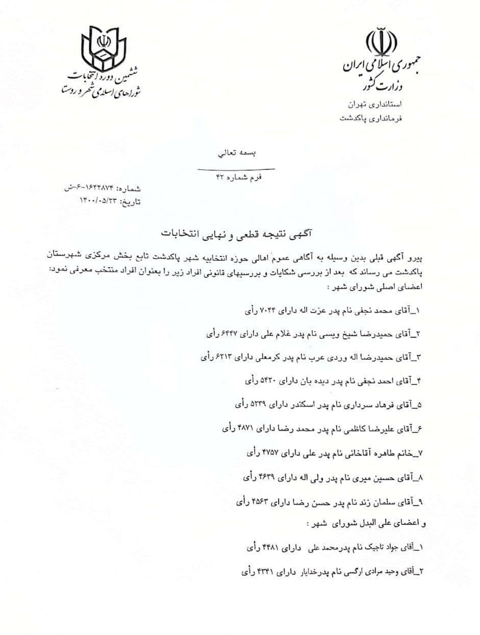 آگهی نتیجه قطعی و نهایی انتخابات ششمین دوره شورای اسلامی شهر پاکدشت منتشر شد .