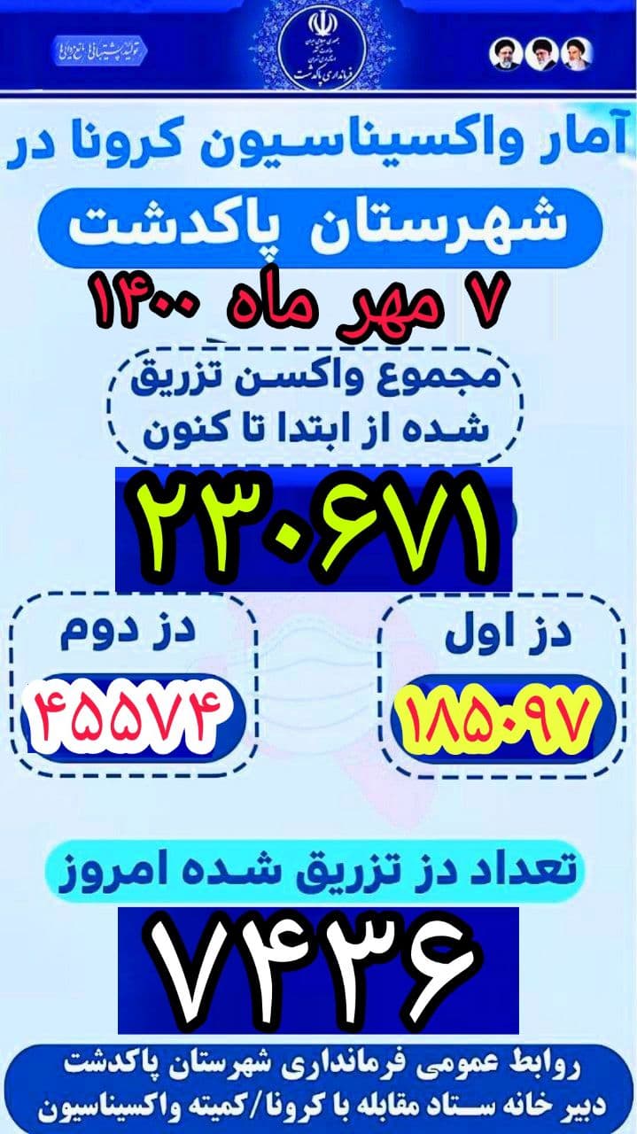 آخرین آمار واکسیناسیون کرونا در شهرستان پاکدشت ،۷ مهر ماه/ تاکنون بیش از ۲۳۰ هزار نفر واکسینه شدند.