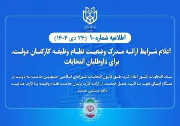 شرایط ارائه مدرک وضعیت نظام وظیفه کارکنان دولت برای داوطلبان انتخابات هفتمین دوره شوراهای اسلامی شهر و روستا تشزیح شد.